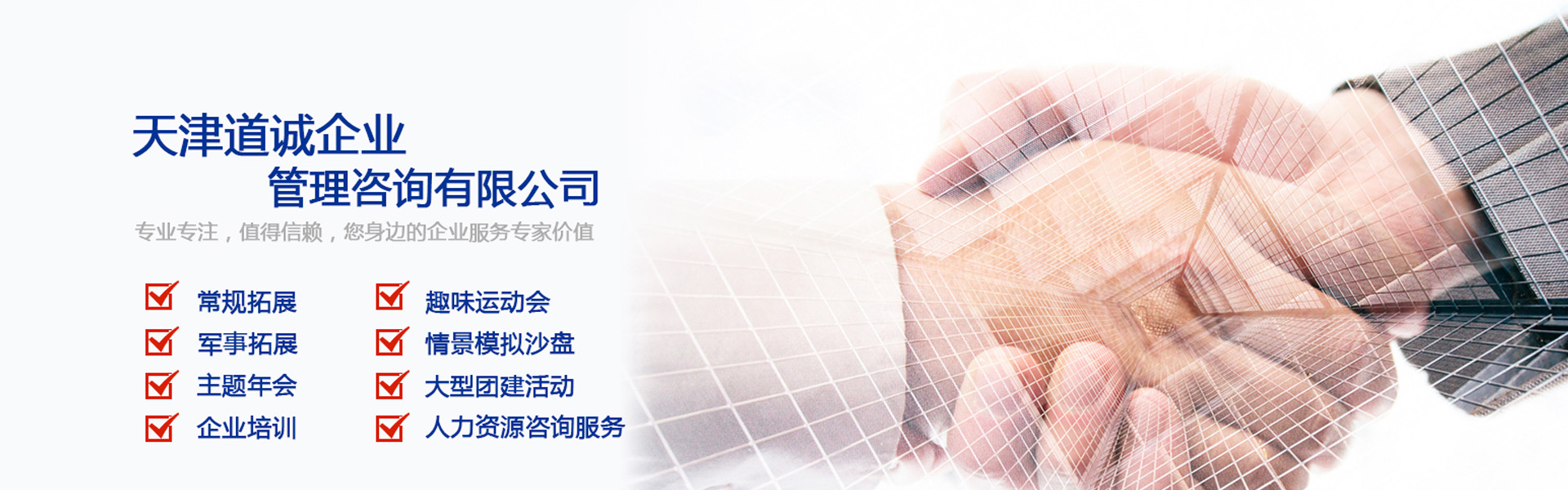 ? ? 道誠(chéng)培訓(xùn)是天津道誠(chéng)企業(yè)管理咨詢有限公司旗下品牌,公司涉及的領(lǐng)域有:拓展培訓(xùn)(團(tuán)建)、企業(yè)內(nèi)訓(xùn)、真人cs、戶外野戰(zhàn)訓(xùn)練、企業(yè)年會(huì)、企業(yè)家庭日、趣味運(yùn)動(dòng)會(huì)、軍事魔訓(xùn)及人才培訓(xùn)和人才測(cè)評(píng)等多項(xiàng)企業(yè)培訓(xùn)及人才開發(fā)咨詢服務(wù)項(xiàng)目。? ? ?道誠(chéng)培訓(xùn)在京津冀區(qū)域擁有多個(gè)大型的戶外拓展訓(xùn)練基地和軍事野戰(zhàn)訓(xùn)練營(yíng)地,并擁有一批從事行業(yè)內(nèi)十余年經(jīng)驗(yàn)的拓展培訓(xùn)師和優(yōu)秀的退役軍官,為不同領(lǐng)域的企業(yè)在發(fā)展戰(zhàn)略、領(lǐng)導(dǎo)能力、團(tuán)隊(duì)建設(shè)、客戶服務(wù)、經(jīng)營(yíng)管理、人力資源和企業(yè)文化和高等學(xué)校提供優(yōu)質(zhì)服務(wù)和解決...